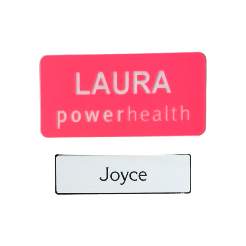 Our standard name badge is a 1x3" rectangle, laser cut with rounded corners for optimal comfort. However, they can be customized in many different ways! Scroll down to learn more about the process, or click the button below to see options and pricing.