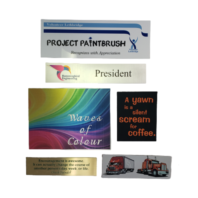 We specialize in large orders of lamacoids, including varying sizes and text, with easily readable text and your choice of backing.