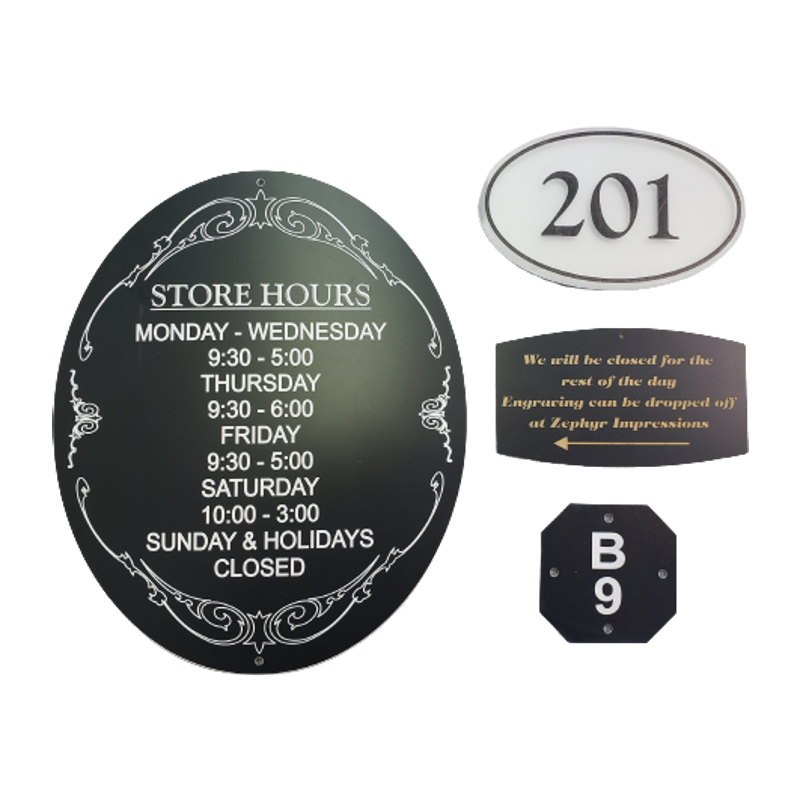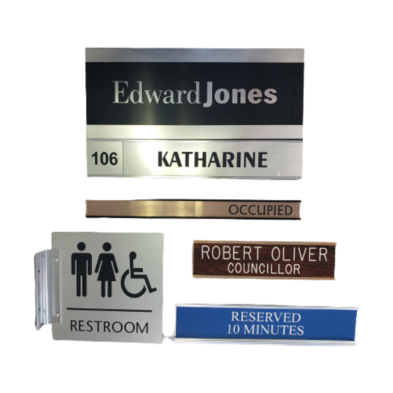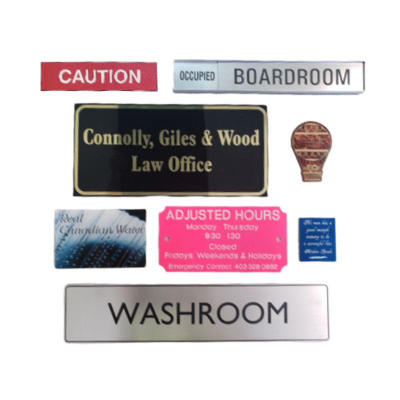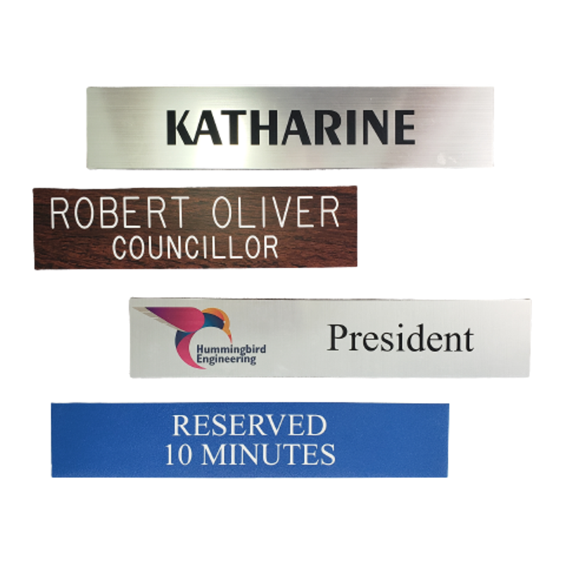Our most popular signs are name plates for desks or offices. Though we can also create custom sizes and shapes, our standard sizes are: