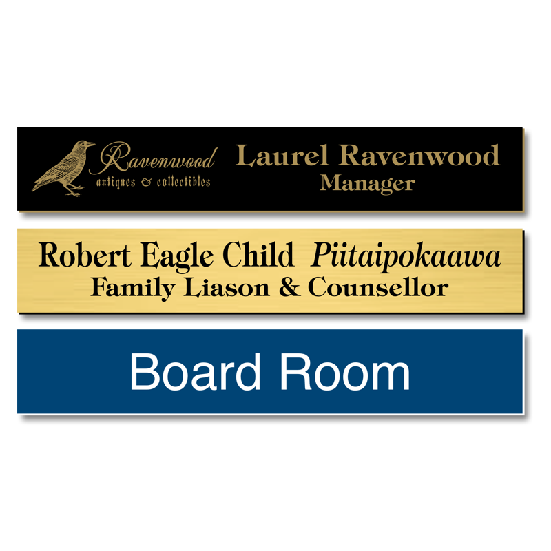 Our standard 2x12" name plates are nearly infinitely customizable! They are available with single colour laser engraving on a variety of plastic options, and can include names, titles, pronouns, logos, and more.