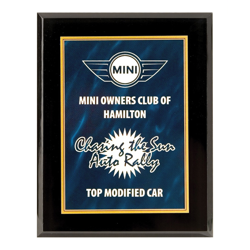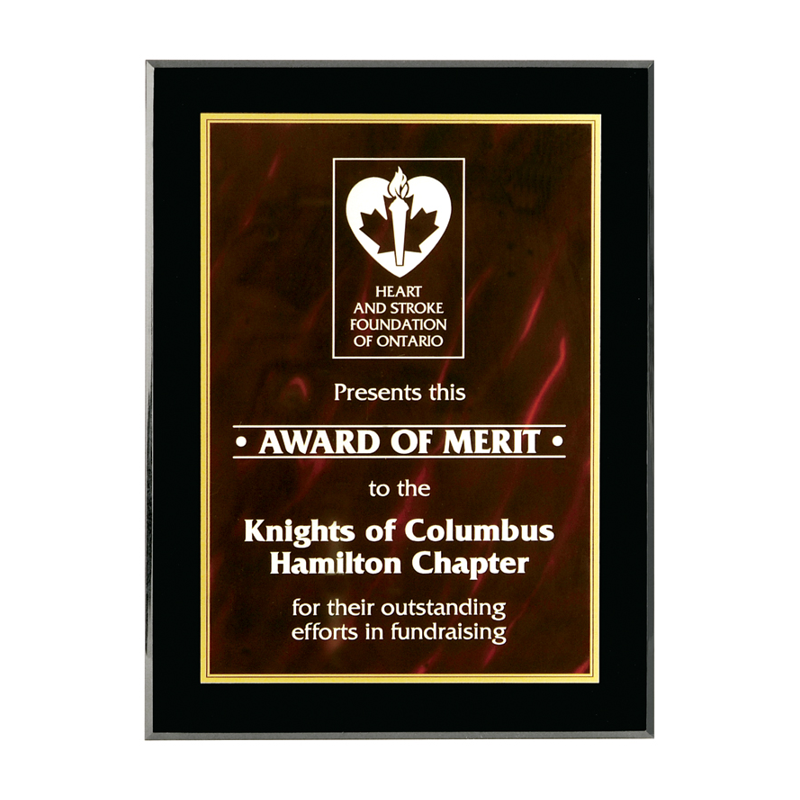 A coloured acrylic plaque with a marbleized pattern and a goldtone and black border, perfect for recognizing a major achievement, whether it's academic, corporate, or personal! Available in two colours and three sizes.