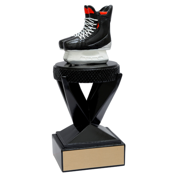 Available in two sizes, the Akimbo award features an angular black base with a four-pronged pedestal, holding aloft a hockey puck and skates.