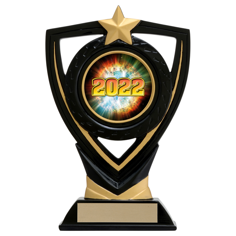 Available in 2 different sizes, the Apex Shield series features a shield-shaped border with hollow cut-outs, showcasing your own custom logo, all topped with a star!