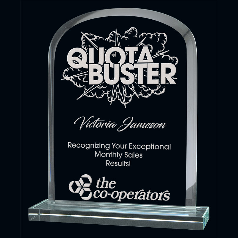 The Astrodome award features a solid glass base, topped with a rounded, rectangular glass panel to highlight the recipient's amazing achievement, surrounded by a wide, beveled edge. Available in three sizes.