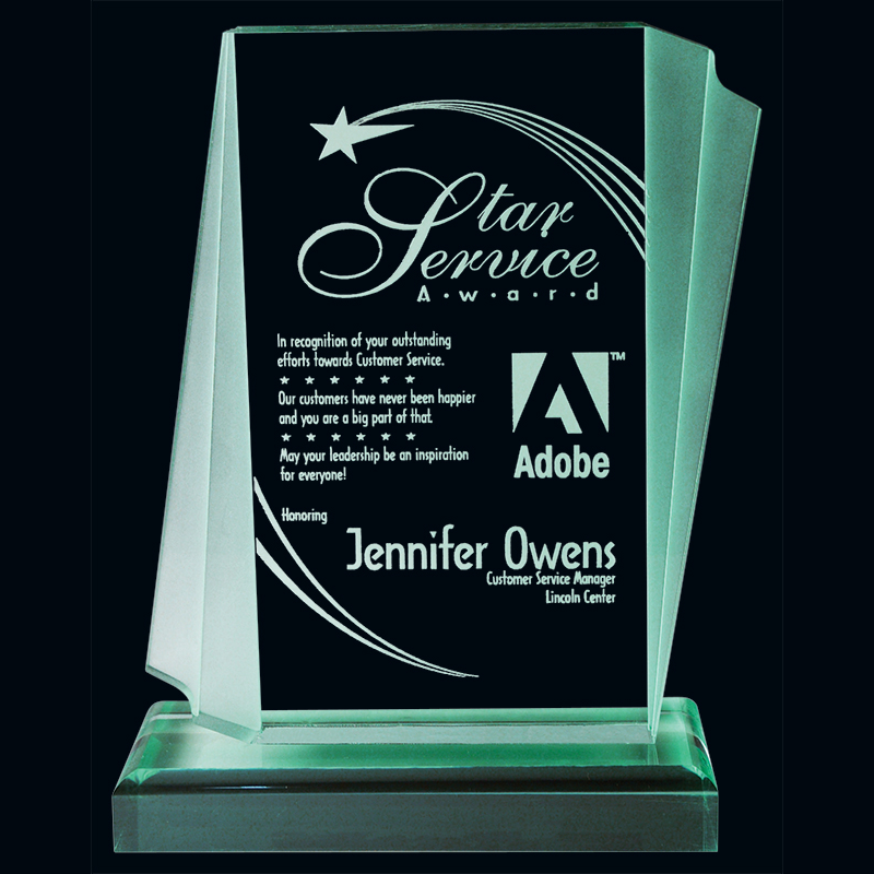Crafted from shining green-toned acrylic, the Aztec award features a rectangular shape with frosted and layered edges, along with a matching base. Perfect for honouring a special accomplishment!