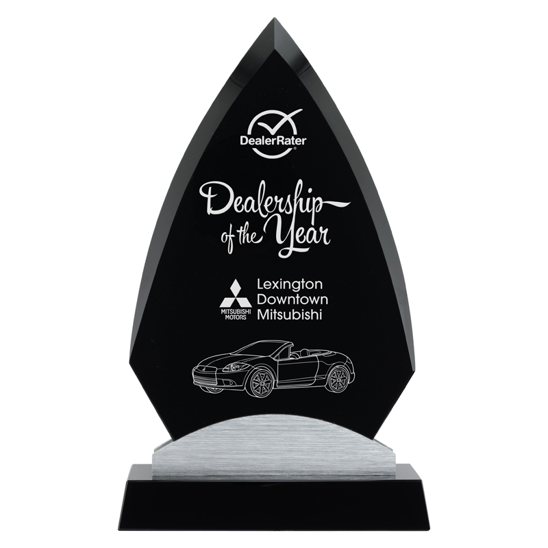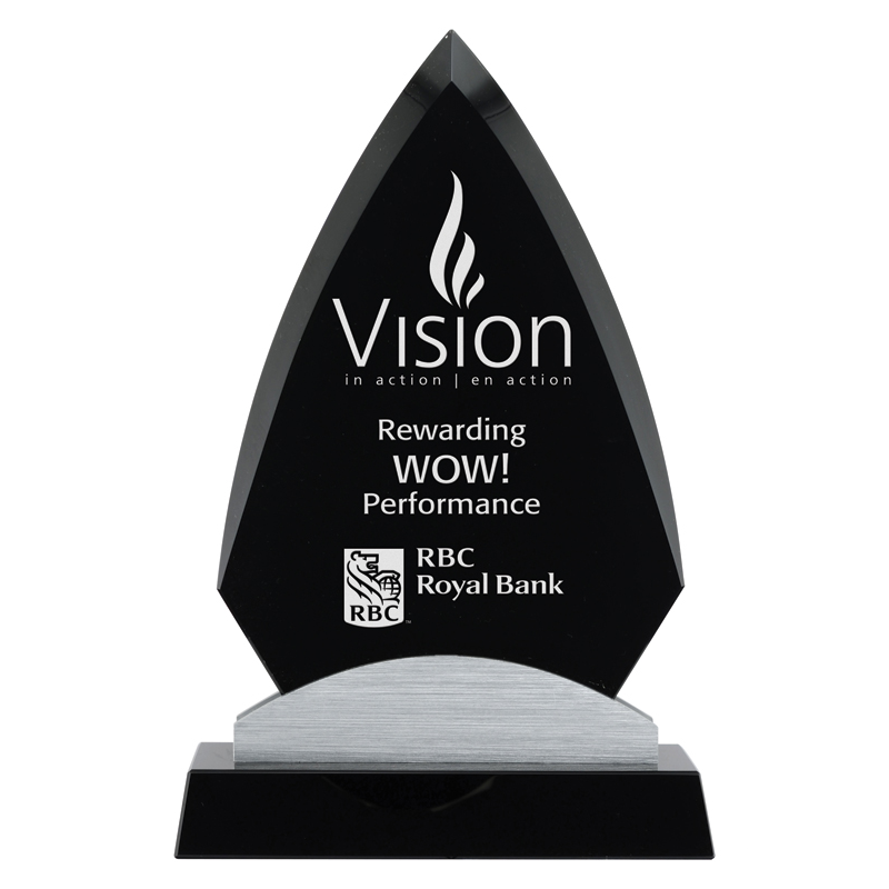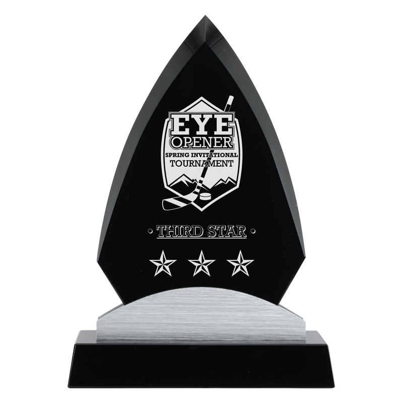 The Anchorage award features a peak-topped, diamond-shape black glass panel, inset into a curved metal sheath, and underscored with a black crystal base. Available in three sizes.