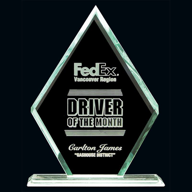 Jade glass is clear, but with a subtle touch of green to create a unique look. The Brunswick award features a diamond shape cut from this material, with beveled edges and a matching beveled base, for a novel twist on a classic award design. Available in two sizes.