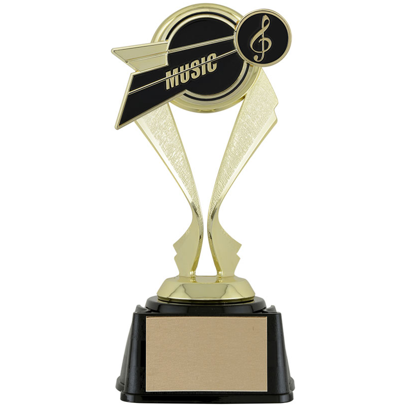 The Bullseye series features a tall, angular pedestal, holding aloft a dynamic, arrow-shaped logo with black and goldtone details. Available with or without a figure topper.