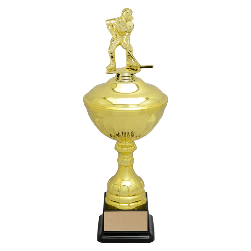 Available in four sizes, the Casilina Cup features a shallow goldtone bowl with subtle, ribbed details on an elegantly molded plastic pedestal. This version of the Casilina also includes a lid and the figure topper of your choice.