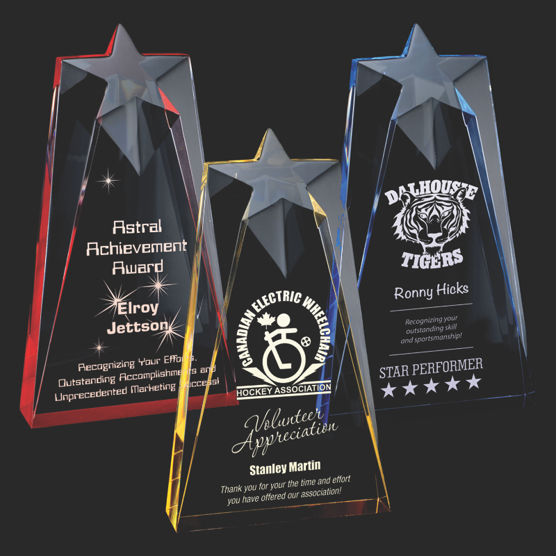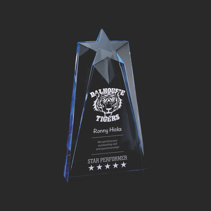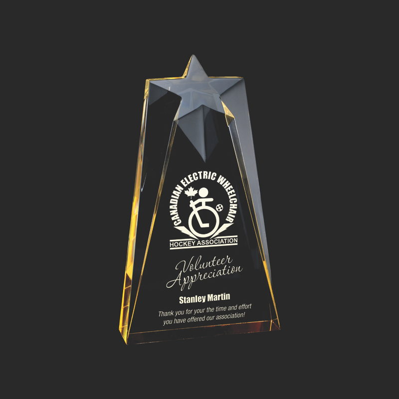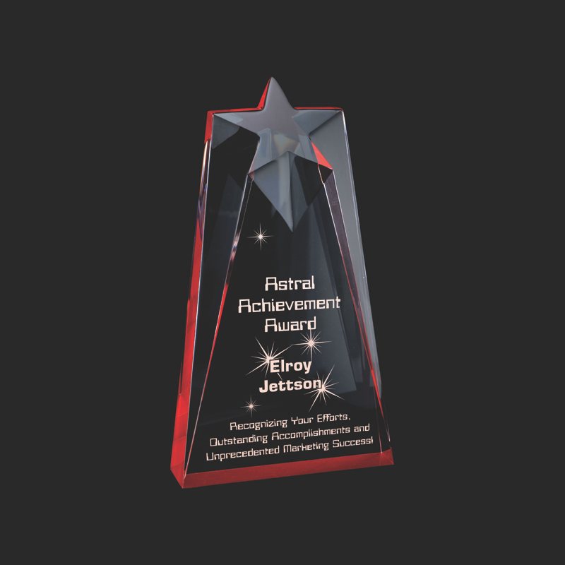 This free-standing award is molded from solid acrylic and features faceted edges, with a coloured base facet to create a striking reflective effect.