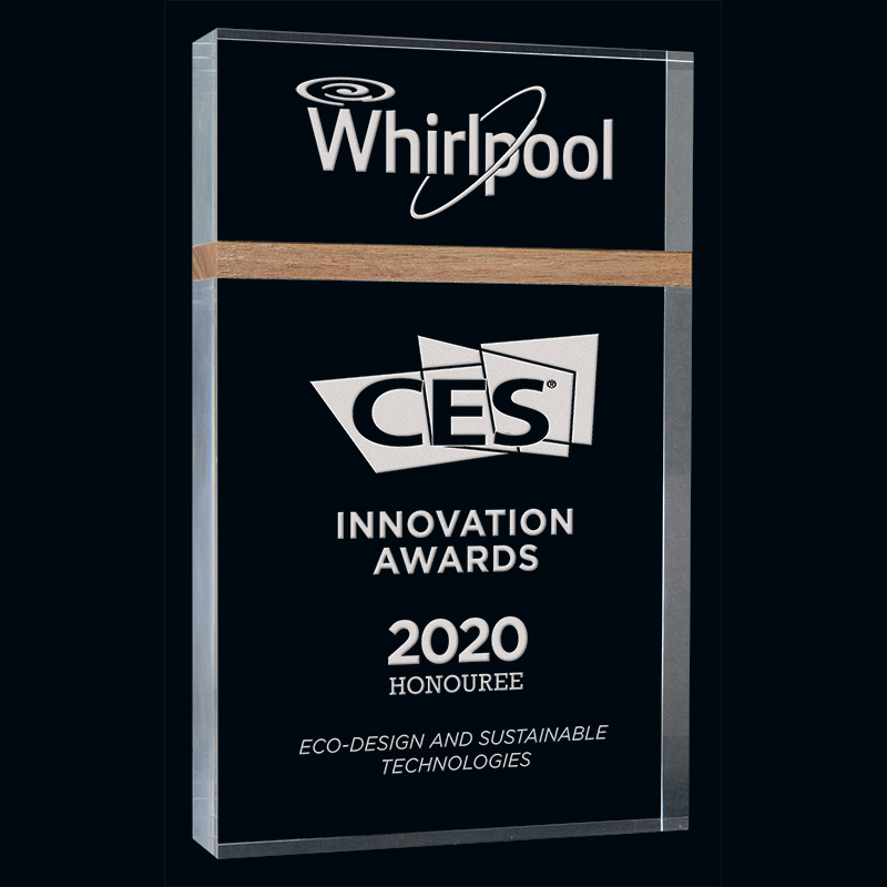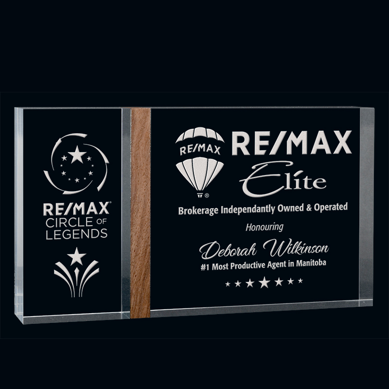 Available in two sizes, the free-standing Beaver award is molded from two pieces of solid acrylic with an inset walnut stripe, for an elegant meld of natural and modern.