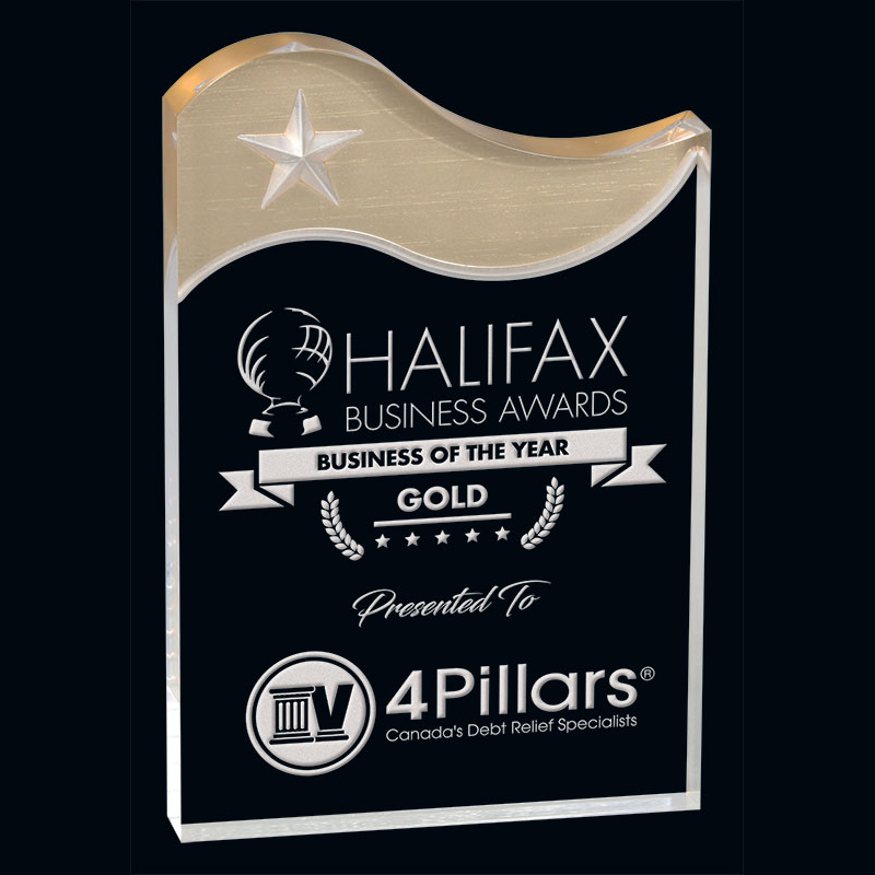 Available in two sizes and molded from solid acrylic, this award features smoothly curving lines, and is topped with an engraved star and brushed goldtone details.