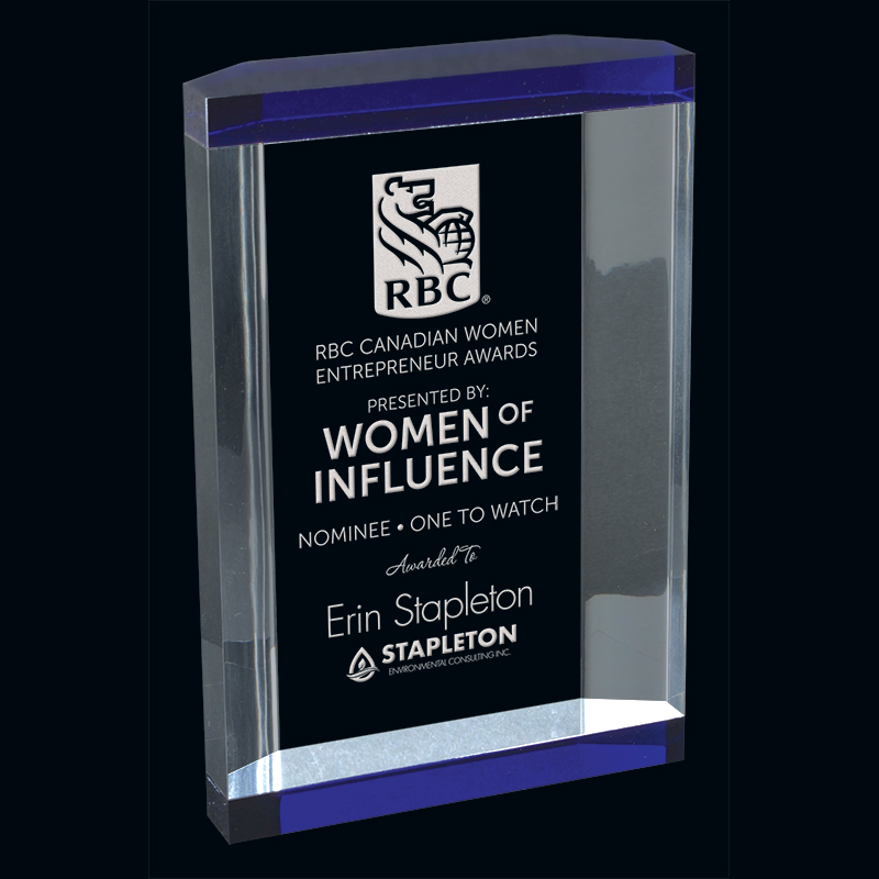 Available in three sizes, the free-standing Manitou award is molded from solid acrylic with a transparent blue topper and base, for an elegant meld of colours.