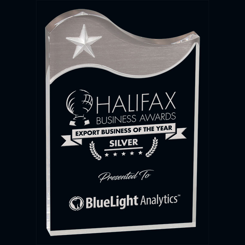 Available in two sizes and molded from solid acrylic, this award features smoothly curving lines, and is topped with an engraved star and brushed silvertone details.