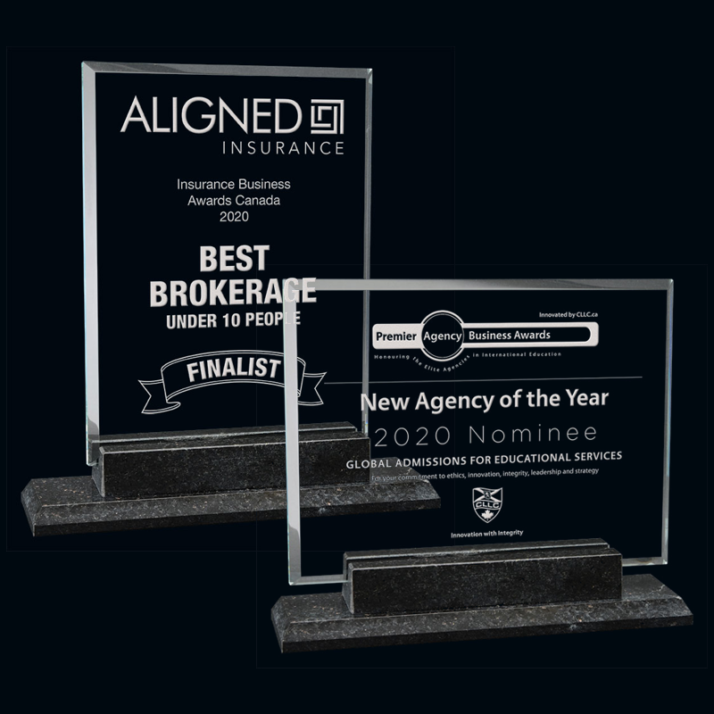 True to its name, the Granite series features awards crafted from crystal clear glass and inset into marbled black granite. The Mesa is rectangular in shape, with beveled edges, and a matching rectangular granite base -- as an added bonus, it can be displayed in portrait or landscape format.