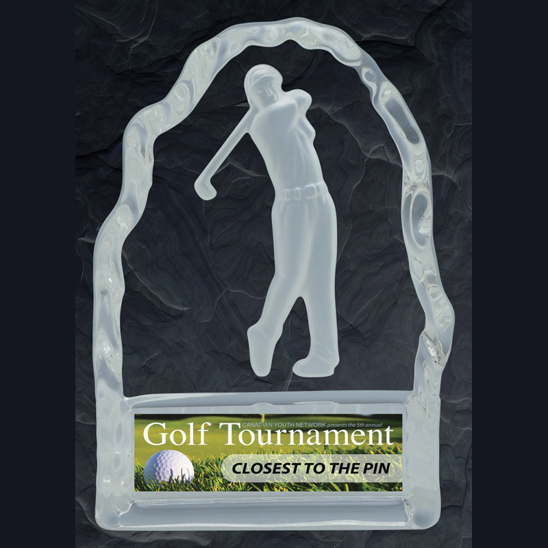 This glass award features a heavy glass block carved into an iceberg-like shape, with your choice of two different golf motifs sandblasted into the surface. Perfect for recognizing a significant achievement!