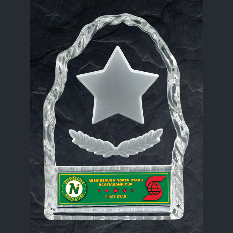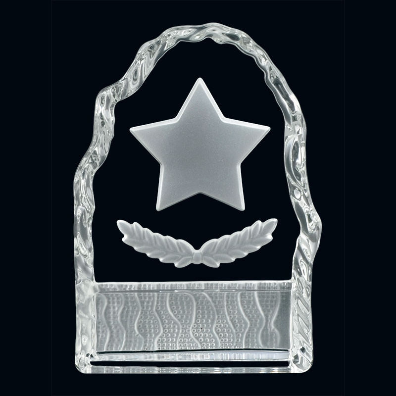 This glass award features a heavy glass block carved into an iceberg-like shape, with victorious laurel wreath and star imagery sandblasted into the surface. Perfect for recognizing a significant achievement!