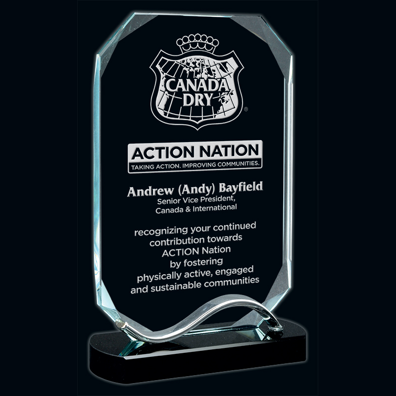 Each award in the River series features a solid black glass base with a curving metal accent to underscore your custom inscription. On the Nile award, the glass panel is rectangular, with angled corners and faceted, beveled edges to catch the light.