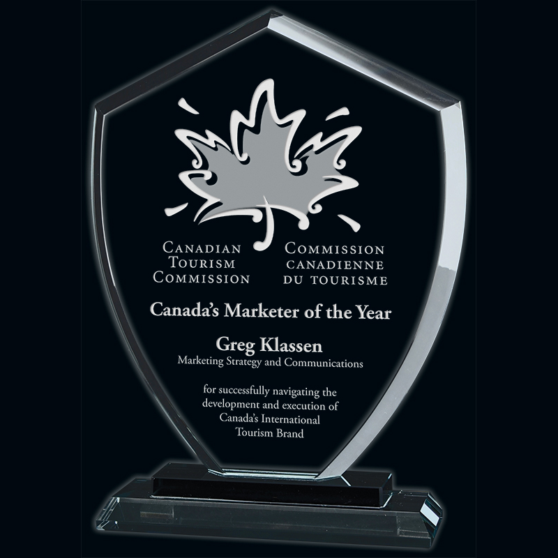 The Conquest award features an angled clear glass base, topped with more black glass, as well as a shield-shaped glass panel with a sparkling peak to show off your custom inscription, all edged with bevel. Available in three sizes.