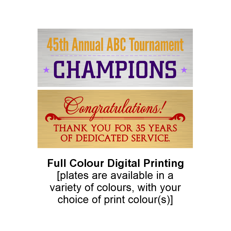 Plates are available in a variety of metal colours, with single colour laser engraving or full colour digital printing.