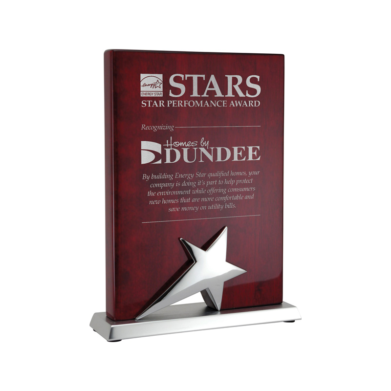 True to its name, the Rosewood star series features high gloss rosewood awards with silvertone metal star decorations. This award is a classic rosewood plaque, with its star centered at the bottom, and a matching silvertone metal base beneath.
