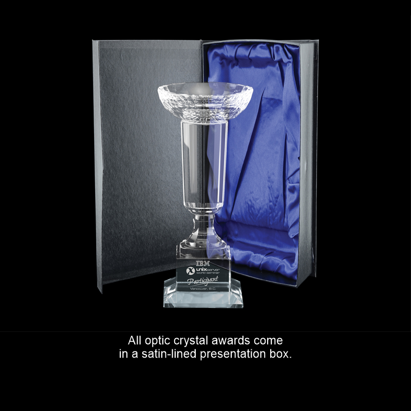 True to its name, the Stratford plate is a large crystal plate, with a smooth centre for your custom inscription, and striking faceted edges, perfect for celebrating your honoree! A plate-holder base is included.