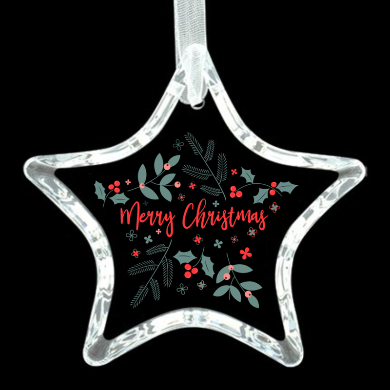 Made from sparkling crystal, this star-shaped ornament features beveled edges and a shimmering ribbon hanger, and can be colour printed with almost anything your imagination can dream up! Perfect for family or company milestones.