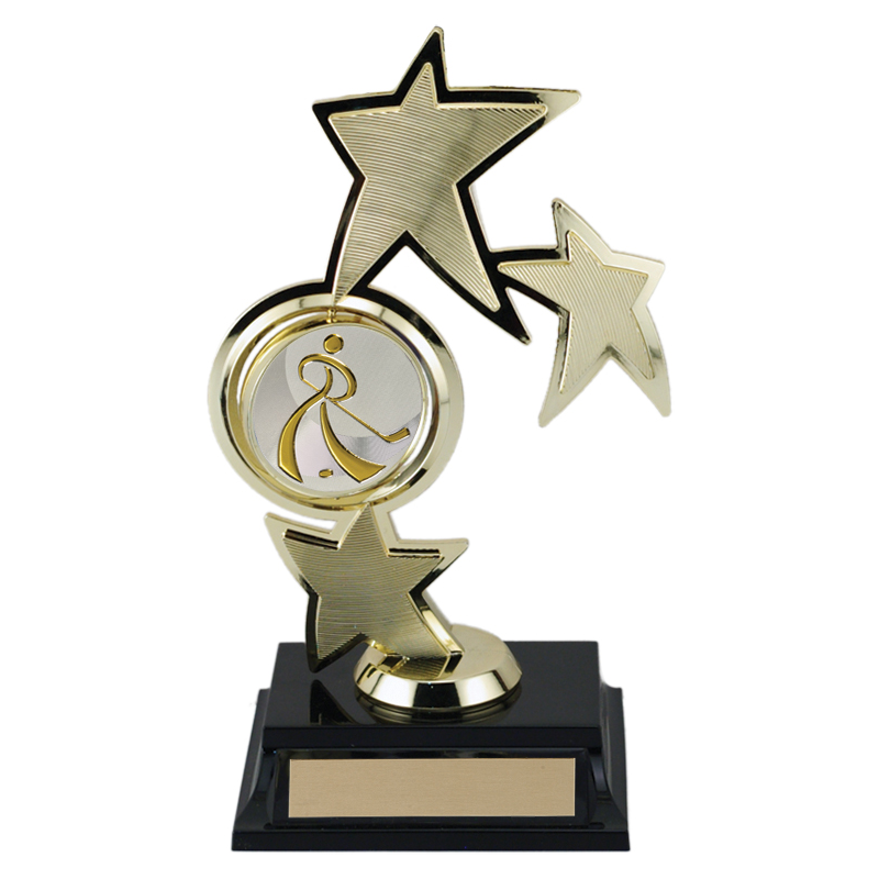 The Spinning Sport trophy features three stacked stars and a goldtone ring surrounding a a spinning disc that showcases your custom logo!