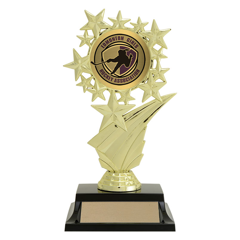 The Star Swoosh trophy features your custom logo atop a dynamic, motion-inspired pedestal and framed by a cluster of celebratory stars!