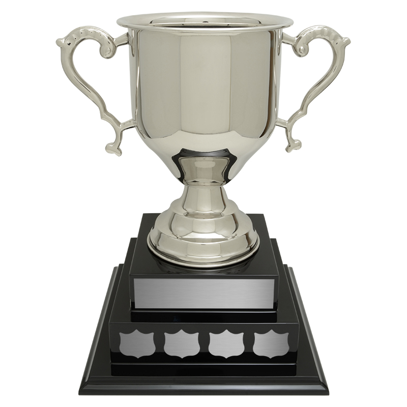 Our Dundee cup, a classic metal cup featuring an open top, vintage-style curved handles, and a layered pedestal, affixed to an layered base for annual use.