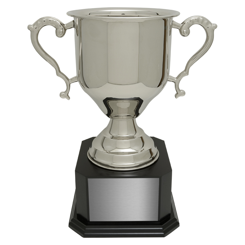 Available in three sizes, this classic metal cup features an open top, vintage-style curved handles, and a layered pedestal, affixed to our Monument Base, an elegant wood laminate base available in two finishes.