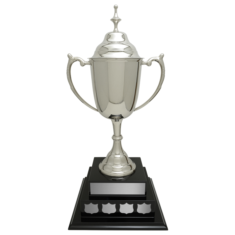 Our Edinburgh cup, a classic metal cup featuring a domed lid, a tall pedestal, and slim, curved handles, affixed to an layered base for annual use.