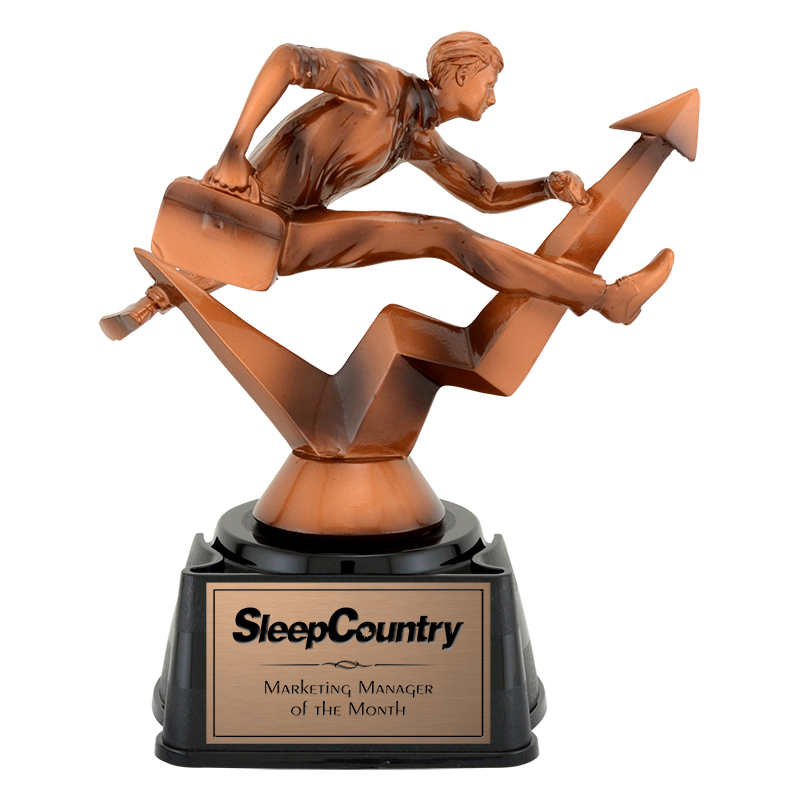 This resin award features a dynamic salesperson in motion, clutching a briefcase and leaping over a quickly rising sales graph. Choose from male and female sculpts.