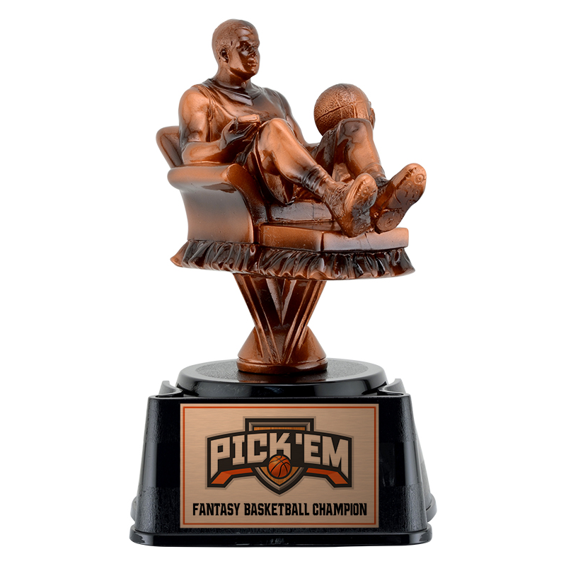 Celebrate the winner of your fantasy basketball pool with this faux-bronze trophy, featuring a comfy basketball fan and his armchair.
