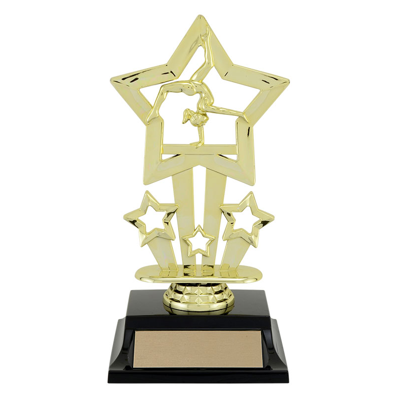 The Trinity series features a shiny goldtone topper on a molded base. The design includes a gymnast on a balance beam, overlaid on a large dynamic shooting star, with three smaller stars to complete the look.
