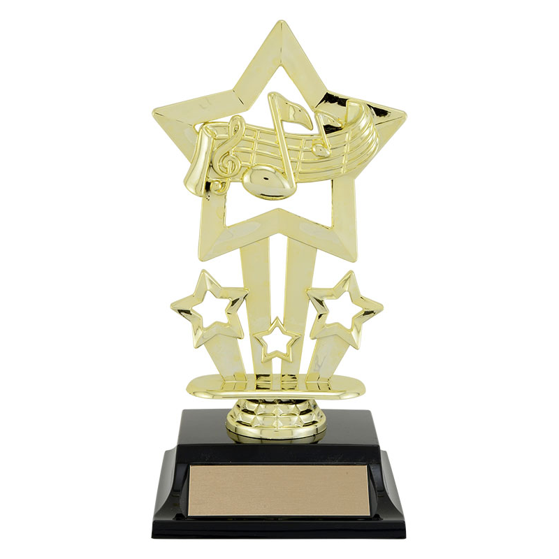 The Trinity series features a shiny goldtone topper on a molded base. The design includes a music staff with a clef and notes, overlaid on a large dynamic shooting star, with three smaller stars to complete the look.