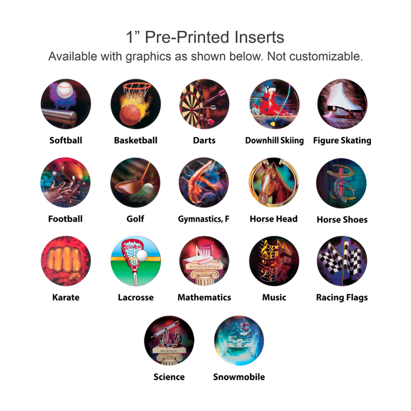 Medal inserts are available in a variety of metal colours, with single colour laser engraving or full colour digital printing. Generic preprinted inserts (not customizable) are also available.