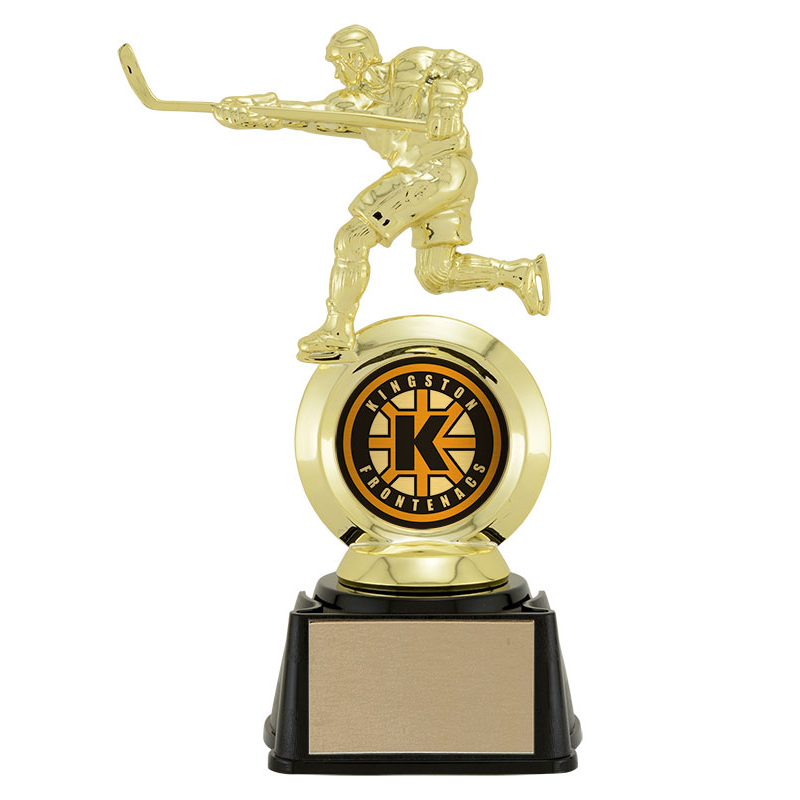 The First Choice series features a shiny goldtone sculpt of a male hockey player, along with a matching circular frame for your custom logo!
