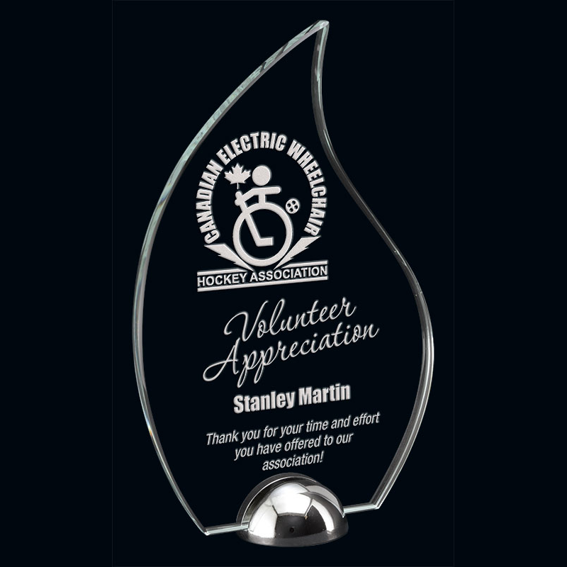 Crafted from crystal clear glass in a simple yet elegant flame shape, along with a half-round metal stand, the Juniper award is the perfect piece to recognize any milestone or achievement!