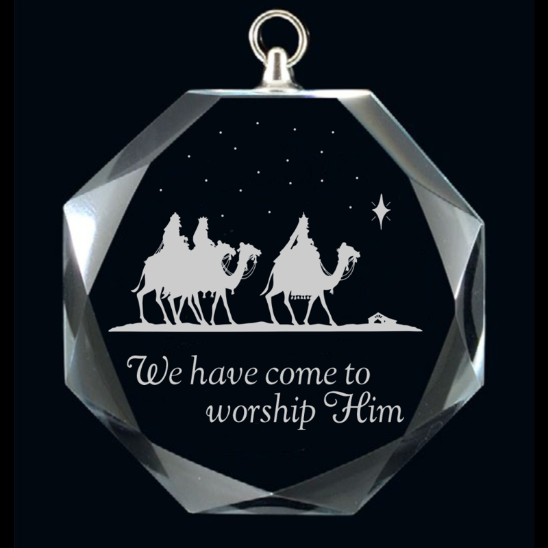 Made from clear, shining glass, this octagon-shaped ornament features faceted edges and a silvertone hanger, and can be colour printed with almost anything your imagination can dream up! Perfect for family or company milestones.