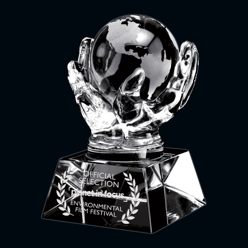 A spherical, engraved crystal globe tops each of the awards in this series. The Ambassador nestles this globe between two open hands, all atop an angular base, perfect for celebrating any major milestone!