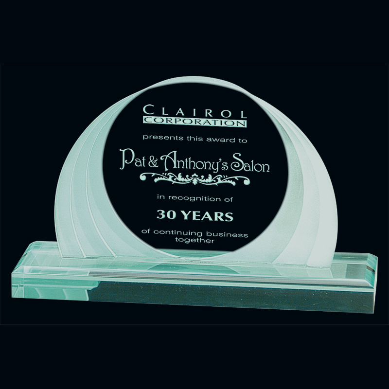 Crafted from shining green-toned acrylic, the Sunset award features a half-round shape with layered, frosted edges and a circular inscription area, along with a matching base. Perfect for honouring a special accomplishment!