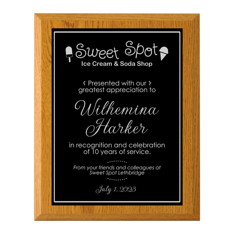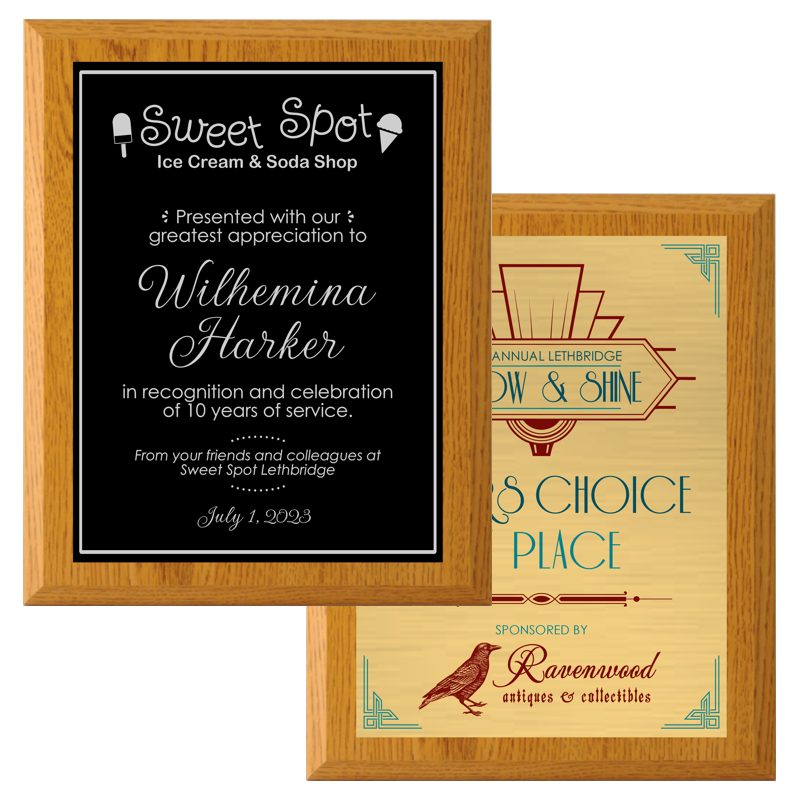 Our classic oak laminate plaque is the perfect canvas on which to build your award! Versatile and customizable, they can be used to recognize any achievement, from sports to academic, from volunteer to corporate, from public to personal. Our talented team of engravers and designers will work with you to create the perfect plaque to suit your event.