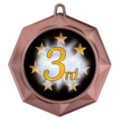 The Octagon medal features an eight-sided border with faceted details, surrounding your custom logo! Choose from antique goldtone, silvertone, or bronzetone, as well as 37 different ribbon colours.