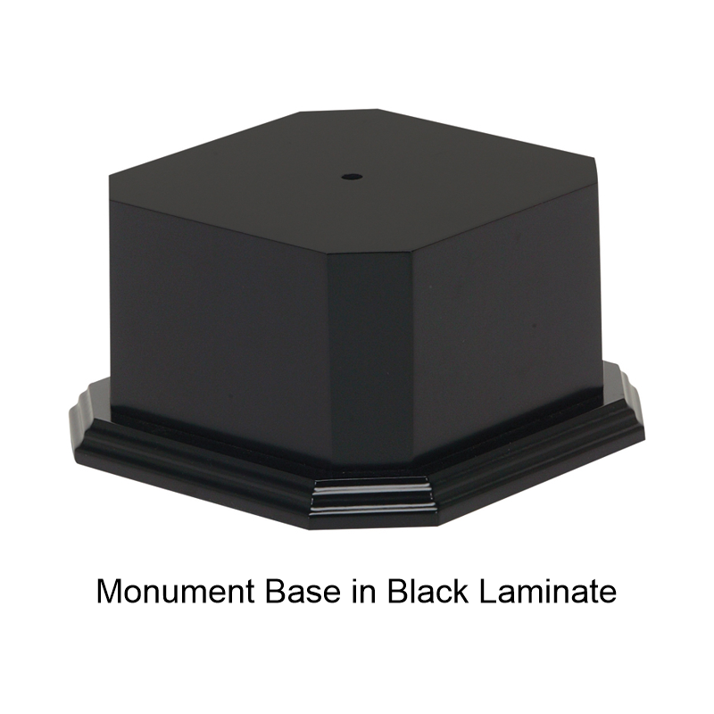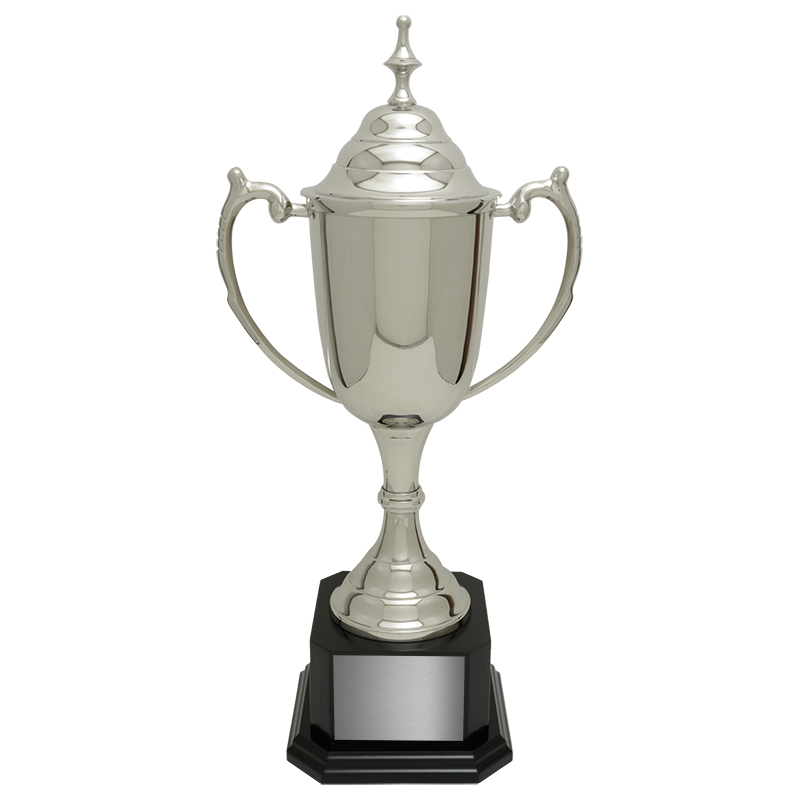 Available in three sizes, this classic metal cup features a domed lid, a tall pedestal, and slim, curved handles, affixed to our Monument Base, an elegant wood laminate base available in two finishes.