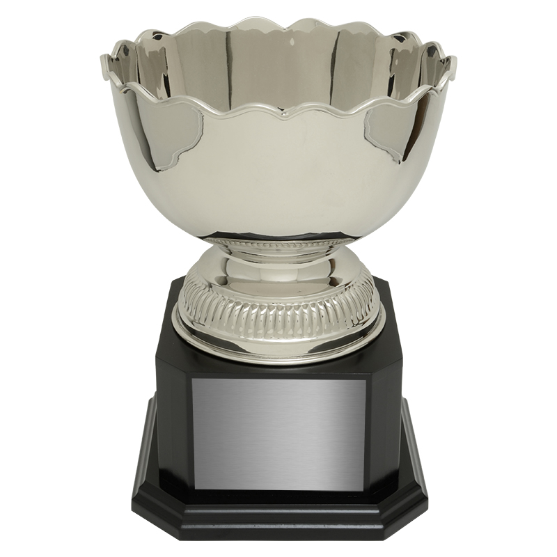 Available in four sizes, this classic metal bowl features a scalloped edge, smooth finish, and a decorated pedestal, affixed to our Monument Base, an elegant wood laminate base available in two finishes.