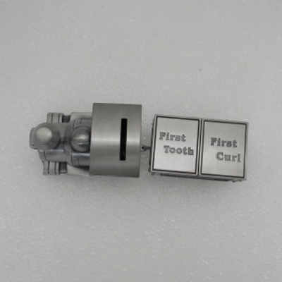 Perfect for the new little one in your life, this pewter-coloured bank features a classic locomotive engine, with a matching train car to commemorate baby's first tooth and first curl!