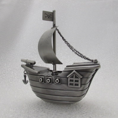 Perfect for the new little one in your life, this pewter-coloured bank features fairy tale imagery of a pirate ship, with a moving mast, an anchor charm, and real chains!