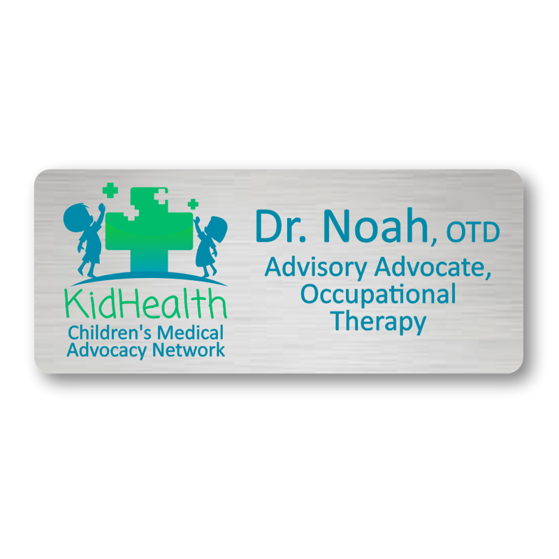 Our name badges are nearly infinitely customizable! This variation features a larger than standard size -- perfect for situations where you need to include a little more information, a bigger logo, or just greater visibility. They are available with full colour digital printing on a variety of plastic options, and can include names, titles, pronouns, logos, and more.