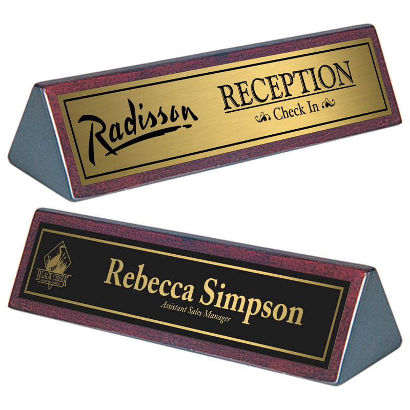 This classic desk name bar features an elongated triangle shape and a high gloss rosewood finish.